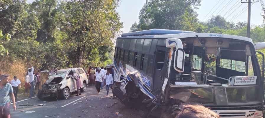 ಬೆಳ್ತಂಗಡಿ: ಇನ್ನೋವಾ ಕಾರು ಹಾಗೂ ಖಾಸಗಿ ಬಸ್ ನಡುವೆ ನಡೆದ ಭೀಕರ ರಸ್ತೆ ಅಪಘಾತದಲ್ಲಿ ಇಬ್ಬರು ಸ್ಥಳದಲ್ಲೇ ಸಾವನಪ್ಪಿರುವ ಘಟನೆ ಬೆಳ್ತಂಗಡಿ ತಾಲೂಕಿನ ವೇಣೂರು ರಸ್ತೆಯ ಗರ್ಡಾಡಿ ಗ್ರಾಮದ ಮೋಗೆರಡ್ಕ ಎಂಬಲ್ಲಿ ಭಾನುವಾರ ನಡೆದಿದೆ.
