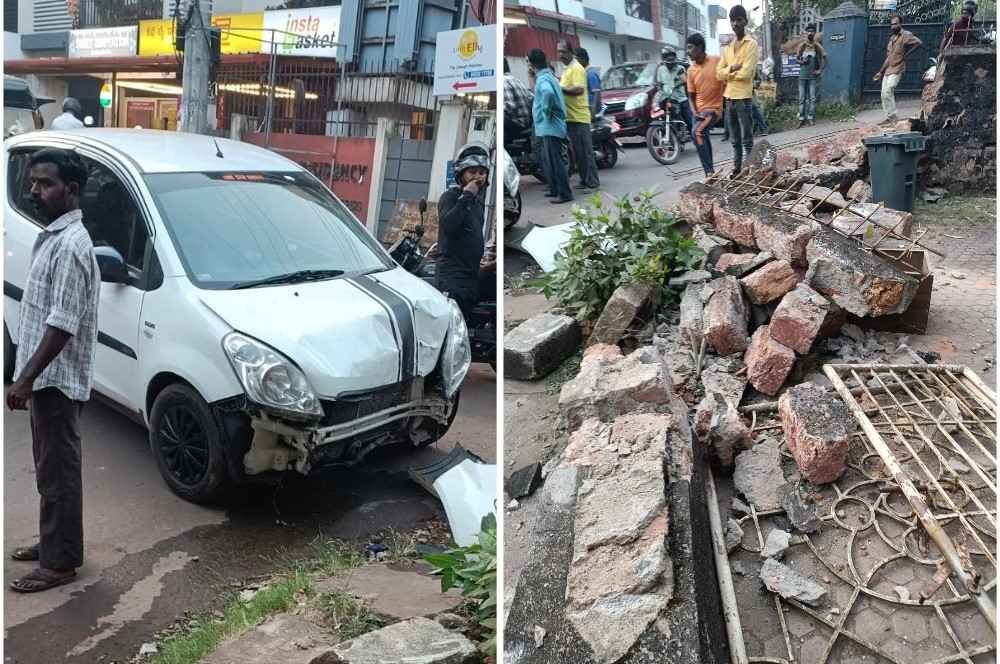 ಮಂಗಳೂರು: ಕುಡಿದ ಮತ್ತಿನಲ್ಲಿ ವೇಗವಾಗಿ ಹಾಗು ಅಜಾರೂಕತೆಯಿಂದ ಕಾರು ಚಲಾಯಿಸಿ ನಿಯಂತ್ರಣ ಕಳೆದುಕೊಂಡ ಕಾರು ಅಪಾರ್ಟ್ಮೆಂಟ್ ಒಂದರ ಕಂಪೌಂಡ್ ಗೋಡೆಗೆ ಗುದ್ದಿ ಸಂಪೂರ್ಣ ಕಂಪೌಂಡ್ ಗೋಡೆ ಕುಸಿದು ಬಿದ್ದ ಘಟನೆ ಮಂಗಳೂರಿನ ಉರ್ವಾ ಸ್ಟೋರಿನಲ್ಲಿ ನಡೆದಿದೆ.