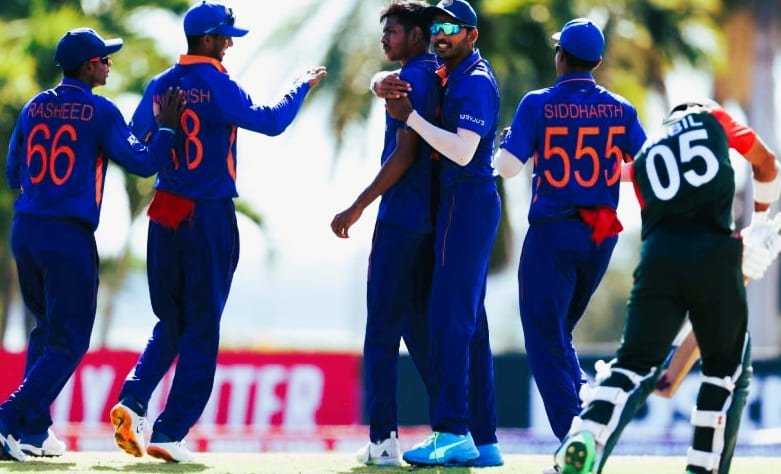ಆಂಟಿಗುವಾ: ಇಲ್ಲಿನ ಕೂಲಿಡ್ಜ್ ಕ್ರಿಕೆಟ್ ಮೈದಾನದಲ್ಲಿ ಶನಿವಾರ ನಡೆದ ಐಸಿಸಿ ಅಂಡರ್-19 ವಿಶ್ವಕಪ್ 2022ರ ಕ್ವಾರ್ಟರ್ ಫೈನಲ್ ಪಂದ್ಯದಲ್ಲಿ ಭಾರತವು ಹಾಲಿ ಚಾಂಪಿಯನ್ ಬಾಂಗ್ಲಾದೇಶವನ್ನು 5 ವಿಕೆಟುಗಳಿಂದ ಮಣಿಸಿ ಕೂಟದ ಸೆಮಿ ಫೈನಲ್ ಪ್ರವೇಶಿಸಿದೆ. ಬಿಗಿಯಾದ ಬೌಲಿಂಗ್ ಧಾಳಿ ಹಾಗು ಆರಂಭಿಕ ಆಂಗ್ಕ್ರಿಶ್ ರಘುವಂಶಿ ಅವರ ಅಮೋಘ 44 ರನ್ನುಗಳು ಭಾರತದ ಗೆಲುವಲ್ಲಿ ಪ್ರಮುಖ ಪಾತ್ರವಹಿಸಿತು .